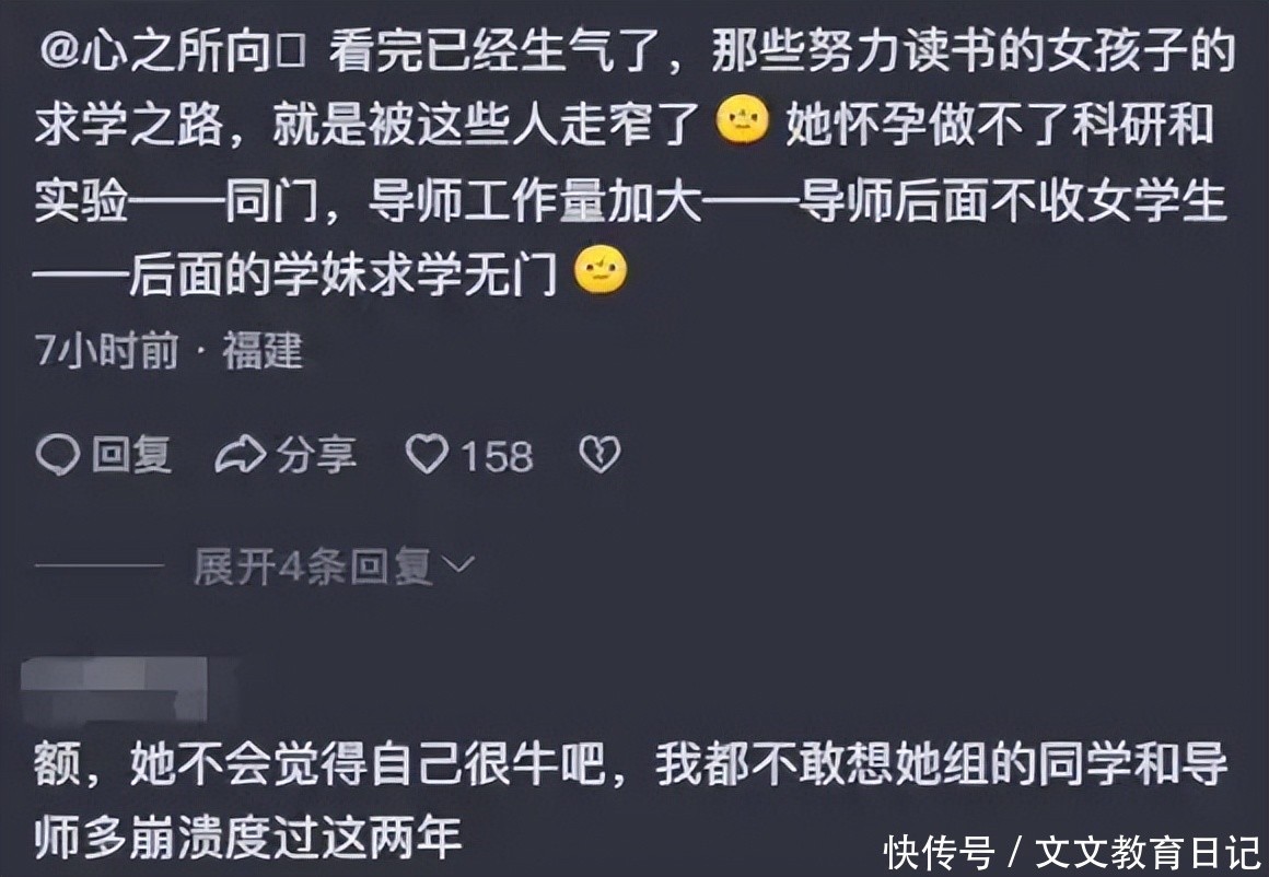 先不说对身体的伤害,就是读研期间需要的精力,就不能很好的保证。不少网友心疼她的同门师兄妹,女生一直在不断的生孩子。